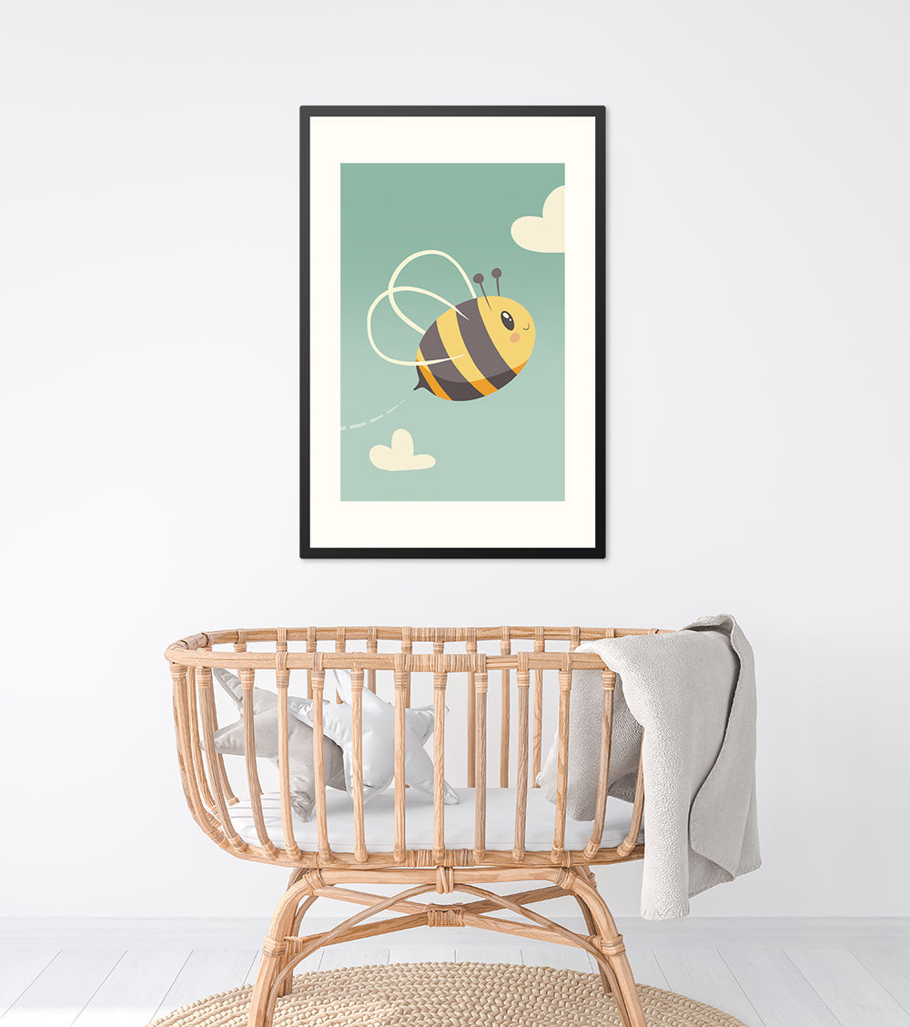 Een poster in een lijst, een leuke toevoeging op een kinderkamer. De poster in lijst is in twee varianten verkrijgbaar namelijk met en zonder passe partout. Op deze afbeelding valt een illustratie te zien van een bij die door de lucht heen vliegt.