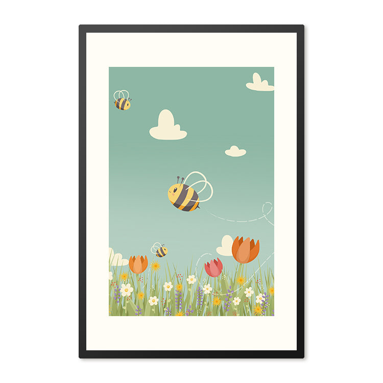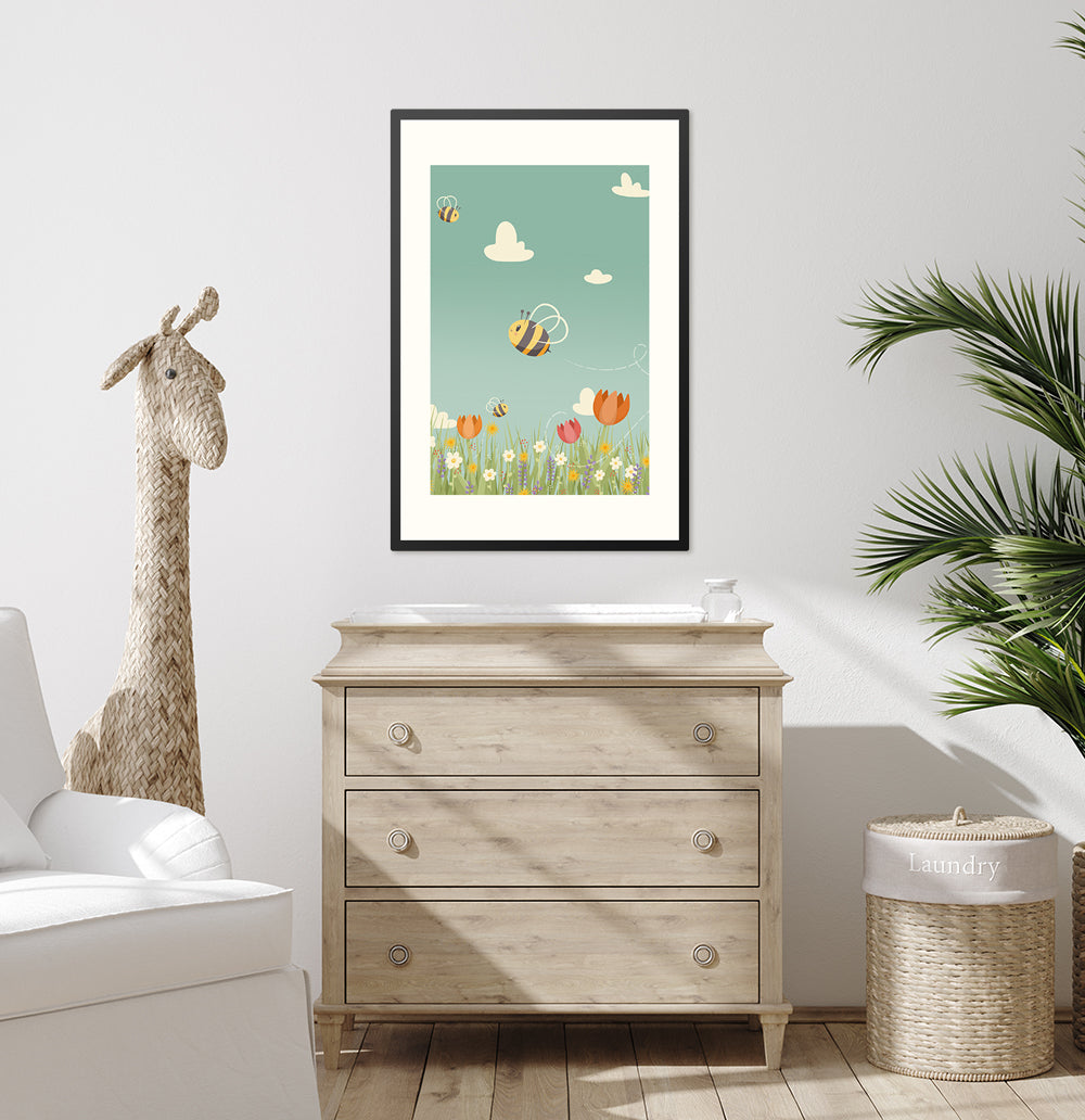 Een poster in een lijst, een leuke toevoeging op een kinderkamer. De poster in lijst is in twee varianten verkrijgbaar namelijk met en zonder passe partout. Op deze afbeelding valt een illustratie te zien van meerdere bijen die over een gras veld met meerdere bloemen en tulpen vliegen.