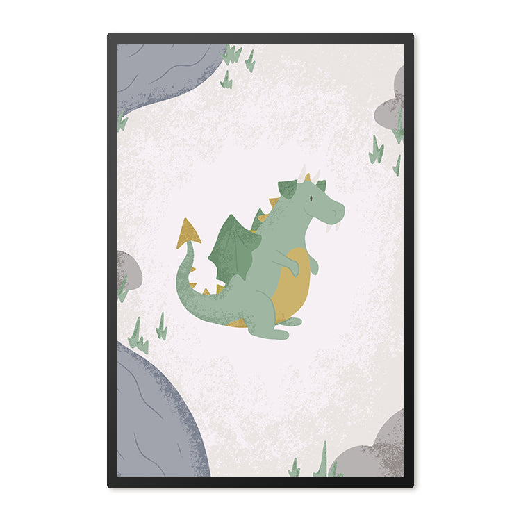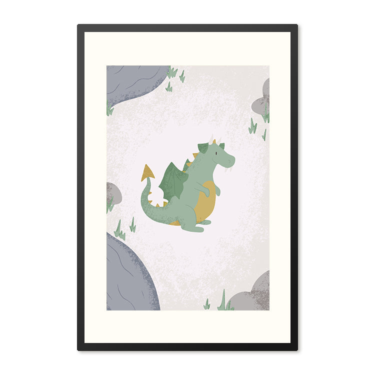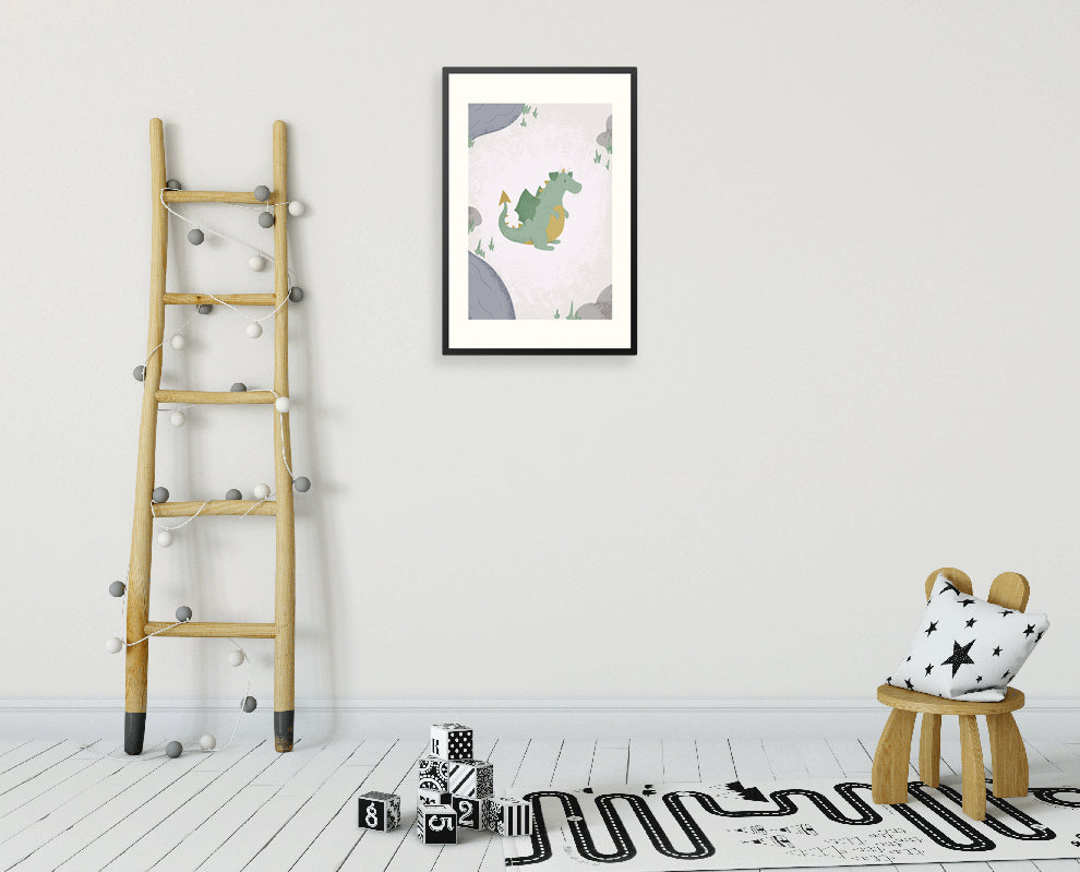De foto in lijst, verkrijgbaar in twee uitvoeringen. De gewone waar de foto de hele lijst vult of de passe partout variant, waar de foto iets kleiner wordt, maar er nog wel een witte rand omheen zit. De passe partout kan zorgen voor iets meer rust! Op de poster valt een kleine groene draak te zien die in een veld stilstaat!
