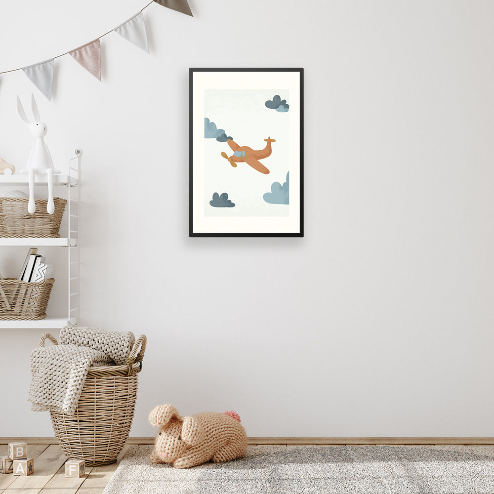 De foto in lijst, verkrijgbaar in twee uitvoeringen. De gewone waar de foto de hele lijst vult of de passe partout variant, waar de foto iets kleiner wordt, maar er nog wel een witte rand omheen zit. De passe partout kan zorgen voor iets meer rust! Op de poster valt een klein zweefvliegtuigje te zien die door de lucht zweeft!