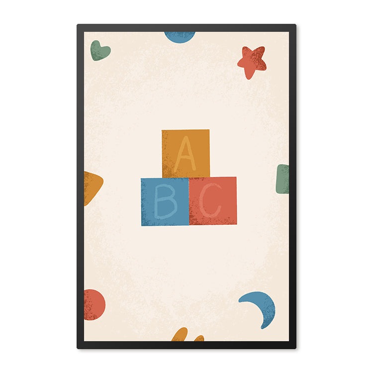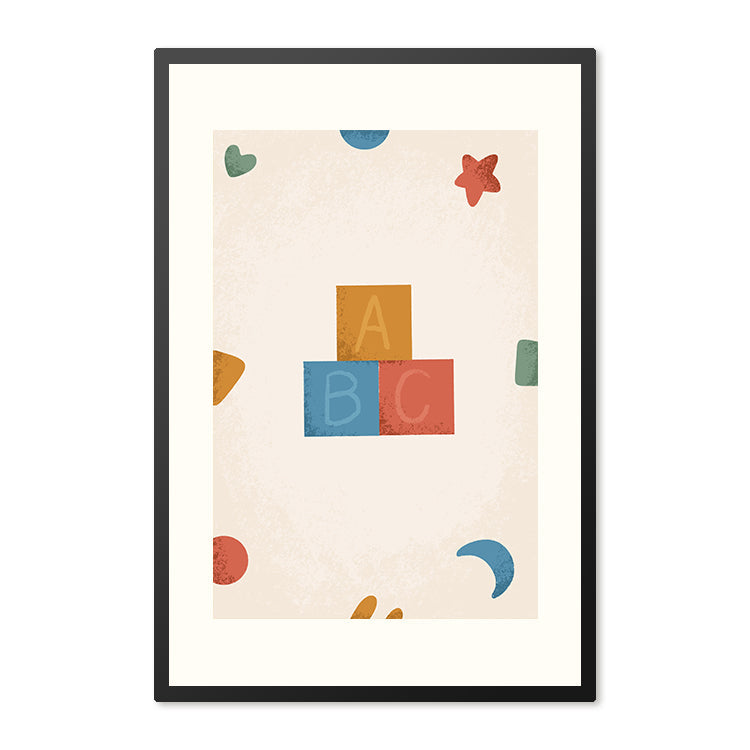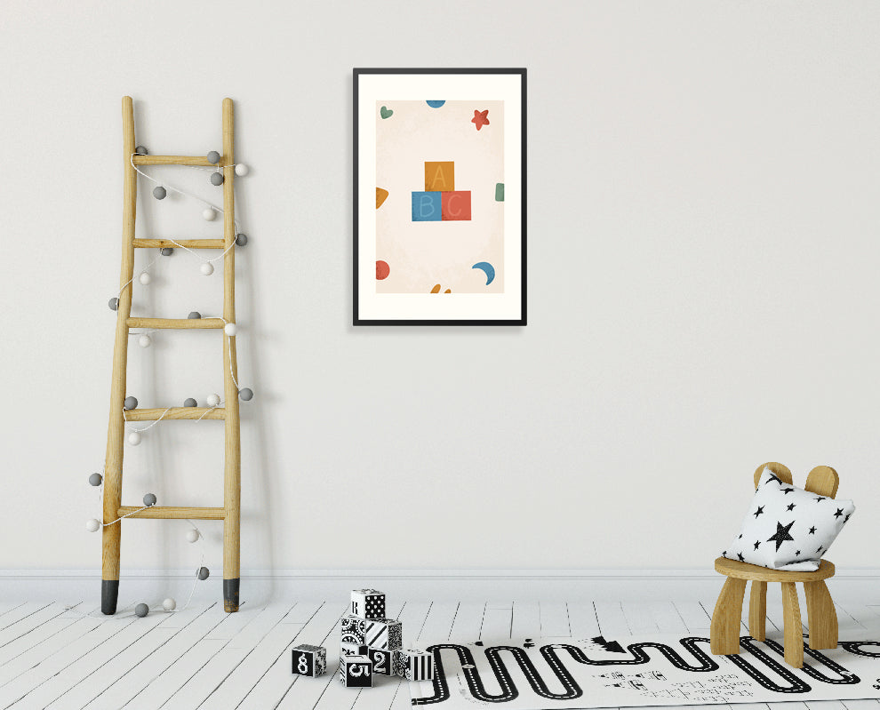 De foto in lijst, verkrijgbaar in twee uitvoeringen. De gewone waar de foto de hele lijst vult of de passe partout variant, waar de foto iets kleiner wordt, maar er nog wel een witte rand omheen zit. De passe partout kan zorgen voor iets meer rust! Op de poster vallen letterblokken te zien met de letters: "A, B en C".