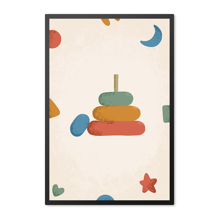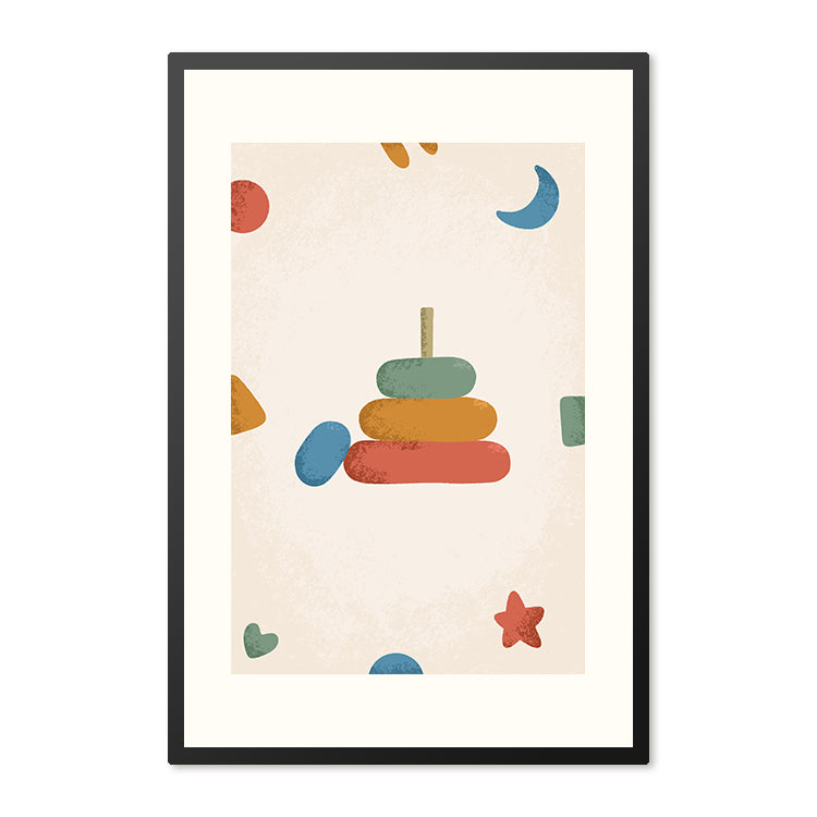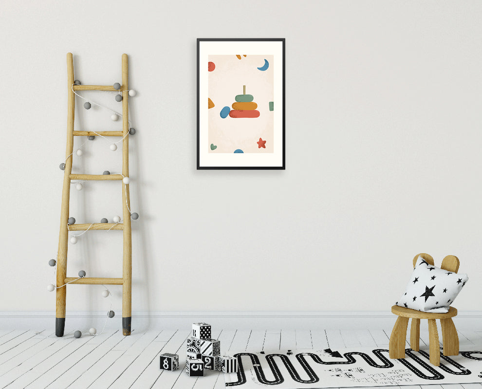 De foto in lijst, verkrijgbaar in twee uitvoeringen. De gewone waar de foto de hele lijst vult of de passe partout variant, waar de foto iets kleiner wordt, maar er nog wel een witte rand omheen zit. De passe partout kan zorgen voor iets meer rust! Op de poster valt een spelletje te zien waar kinderen ringen moeten gooien om een stok en dan op volgorde van groot naar klein.