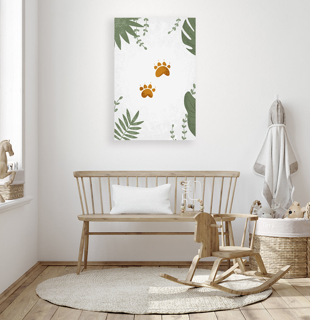 Dit schilderij maakt deel uit van de Ukkie & Boef collectie. Op het schilderij vallen veel bladeren te zien, een natuurlijke omgeving! In het midden van het schilderij zijn voetstappen van een beer te zien! Het schilderij is verkrijgbaar op aluminium, canvas en plexiglas in vier verschillende formaten.