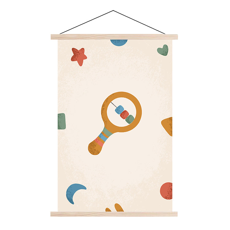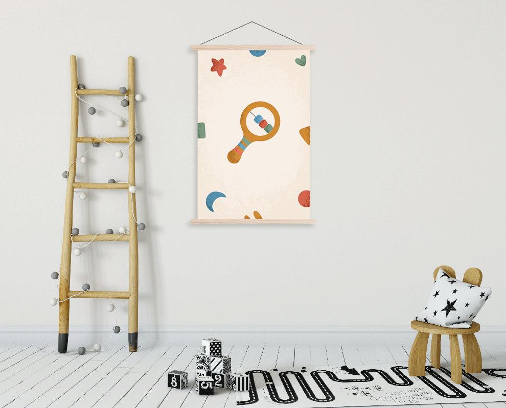 Deze schoolplaat behoort tot de Ukkie & Boef collectie. De schoolplaat is gemaakt van een linnendoek, het doek wordt ook wel canvas genoemd. Het doek wordt op zijn plaatst gehouden door latten aan de boven en onderkant. Op de schoolplaat valt een rammelaar te zien een typisch speeltje voor baby's!