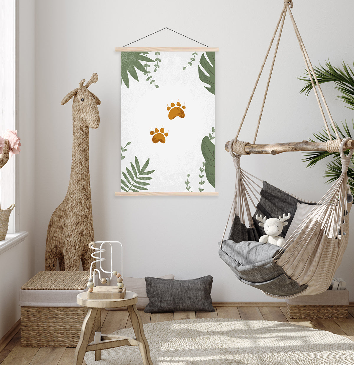 Deze schoolplaat behoort tot de Ukkie & Boef collectie. De schoolplaat is gemaakt van een linnendoek, het doek wordt ook wel canvas genoemd. Het doek wordt op zijn plaatst gehouden door latten aan de boven en onderkant. Op de schoolplaat vallen de pootafdrukken van een beer te zien!