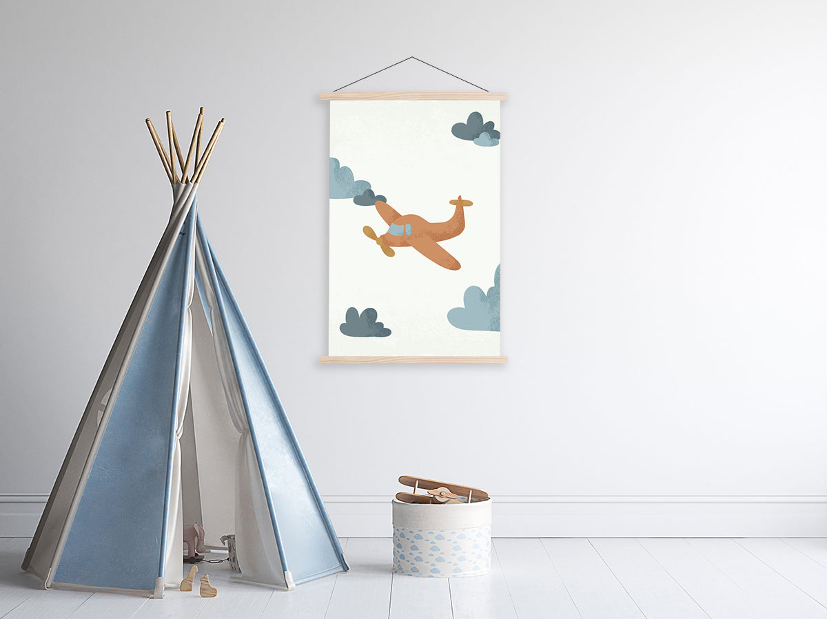 Deze schoolplaat voor in de babykamer behoort tot de Ukkie & Boef collectie. De schoolplaat is gemaakt van een linnendoek, het doek wordt ook wel canvas genoemd. Het doek wordt op zijn plaatst gehouden door latten aan de boven en onderkant. Op de schoolplaat valt een illustratie te zien van een vliegtuigje zwevend door de lucht.